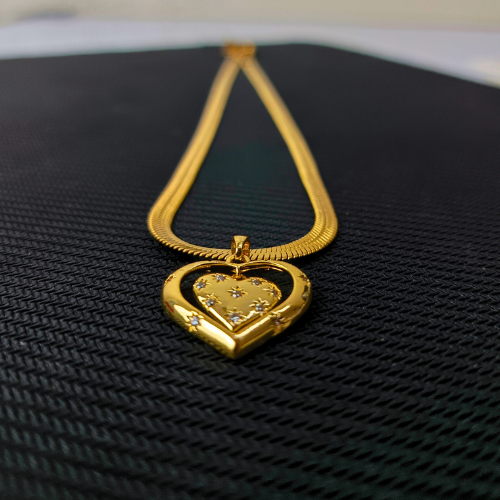 Declare your affection with this charming Dual Heart Serpentine Chain Necklace. A polished gold-toned serpentine chain gracefully suspends a captivating heart pendant, featuring an intricate smaller heart design within, adorned with delicate star-like accents. This piece beautifully symbolizes intertwined love and makes a thoughtful gift or a radiant addition to your own collection.