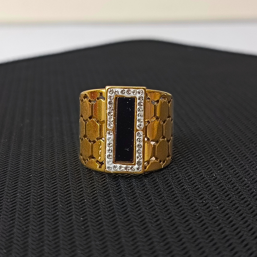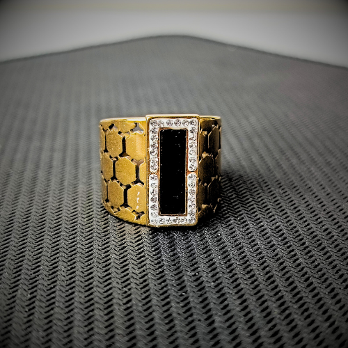 Make a bold statement with this unique and eye-catching ring. The wide, golden band features an intricate honeycomb texture, beautifully contrasting with a sleek, rectangular black onyx stone. The onyx is bordered by a dazzling row of sparkling crystals, making this piece perfect for both day and night.