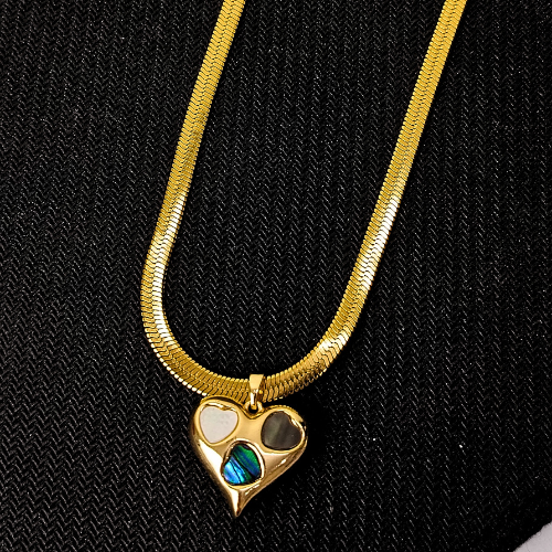 Discover unique beauty with the Mosaic Heart Serpentine Chain Necklace. A lustrous gold-toned serpentine chain holds a charming puffed heart pendant, intricately adorned with shimmering pieces of mother-of-pearl and iridescent abalone shell. Each mosaic piece adds a unique play of light and color, making this necklace a true conversation starter.